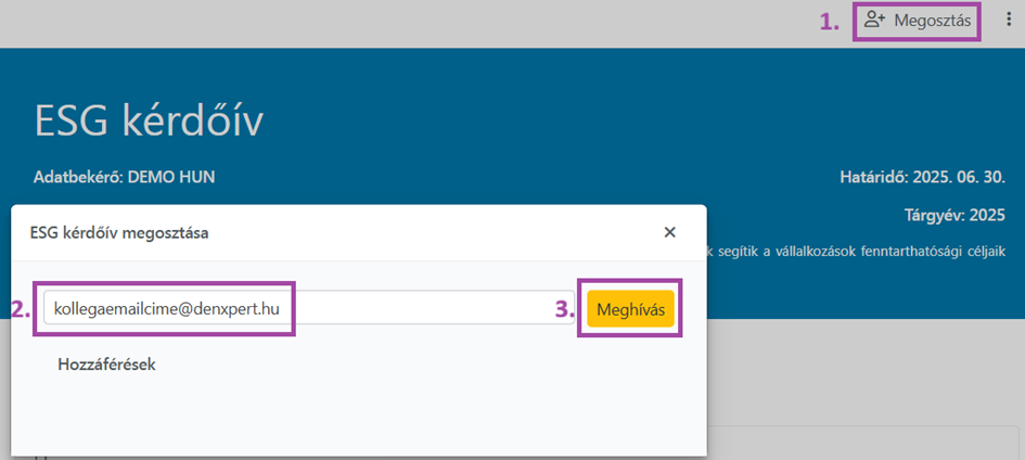 A „Megosztás” gombra kattintva, adja meg az érintett kolléga e-mail címét, majd kattintson a „Meghívás” gombra.